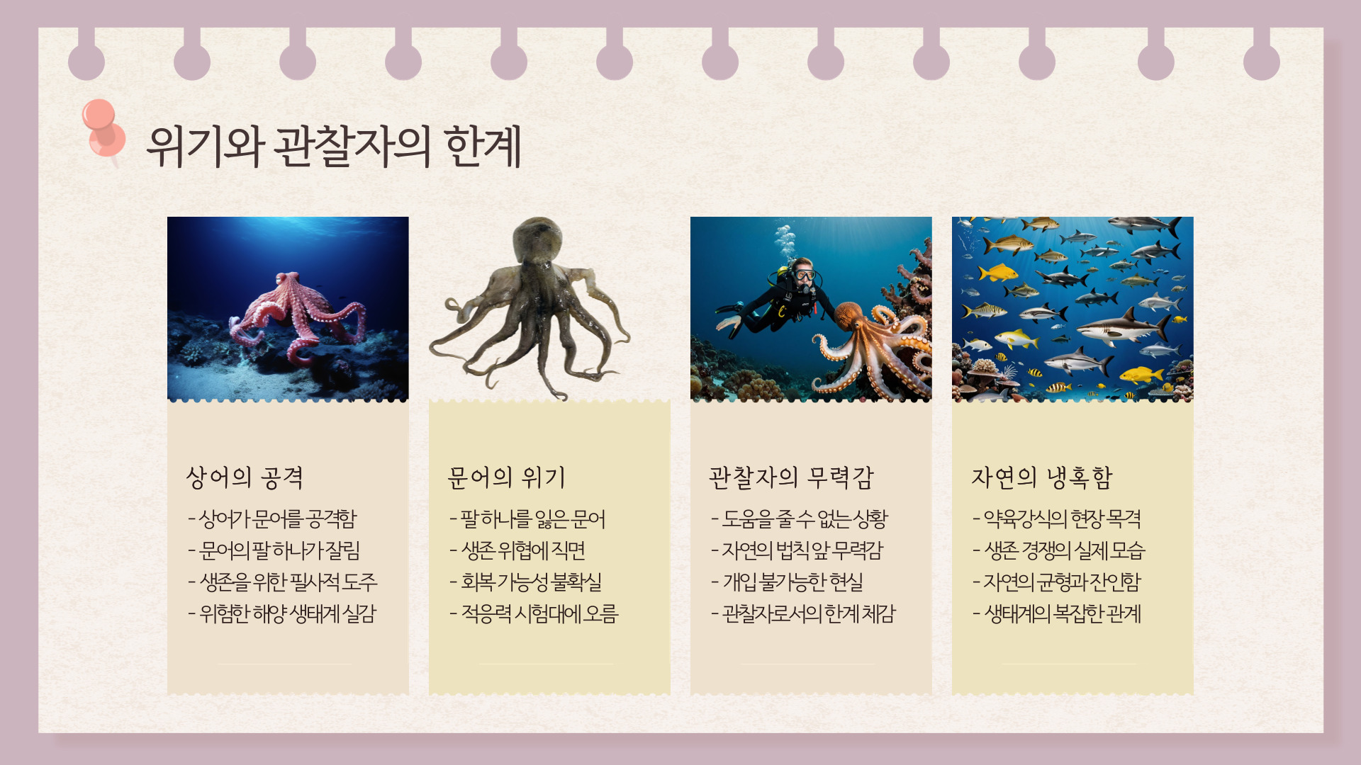 주제문: 문어의 생존 싸움을 지켜보며 나는 자연의 냉혹함과 관찰자로서의 무력함을 절감했다.