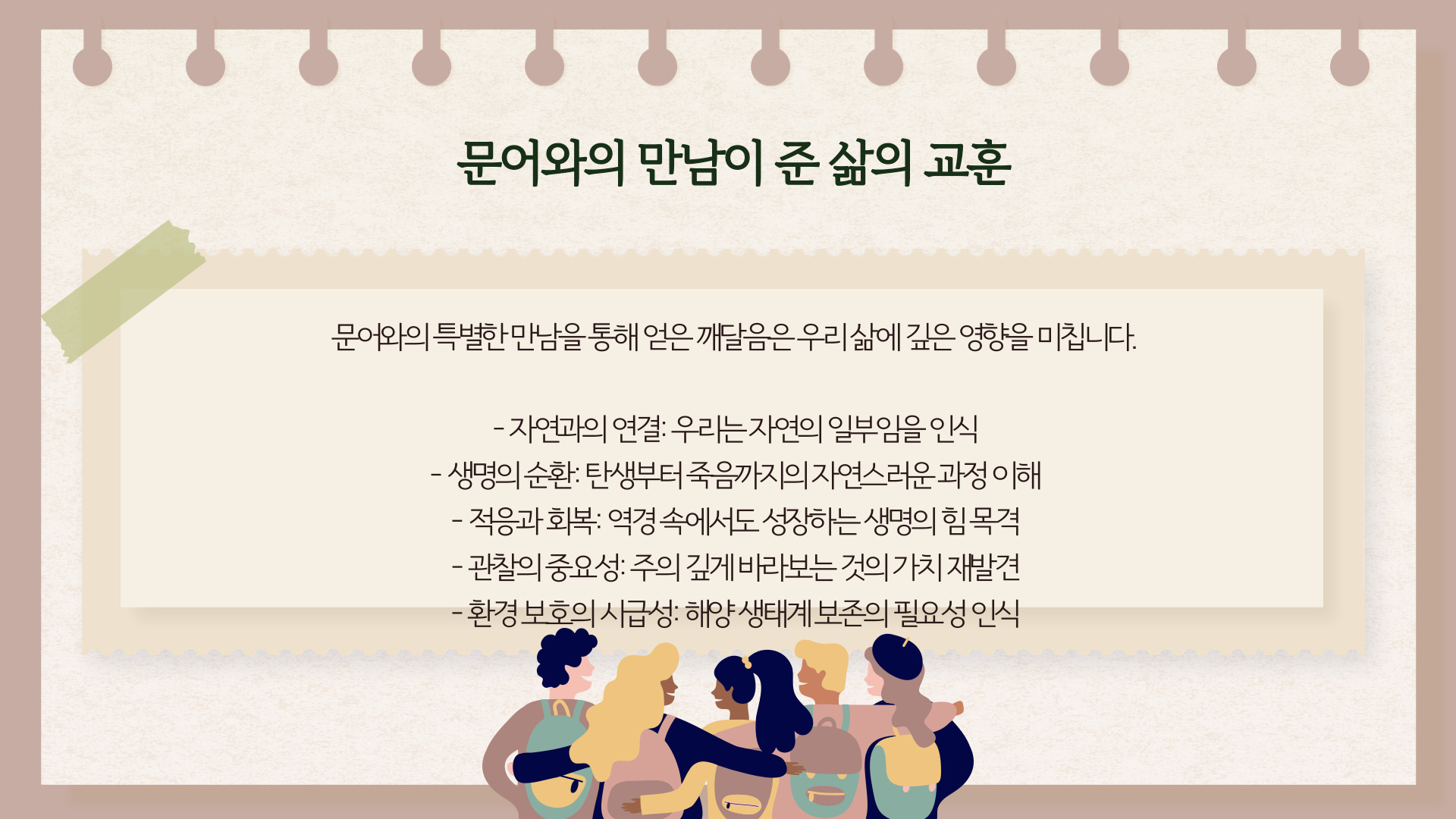 주제문: 문어와의 지속적인 교감 속에서 우리는 친구가 되었고, 진정한 관계가 형성되기 시작했다.